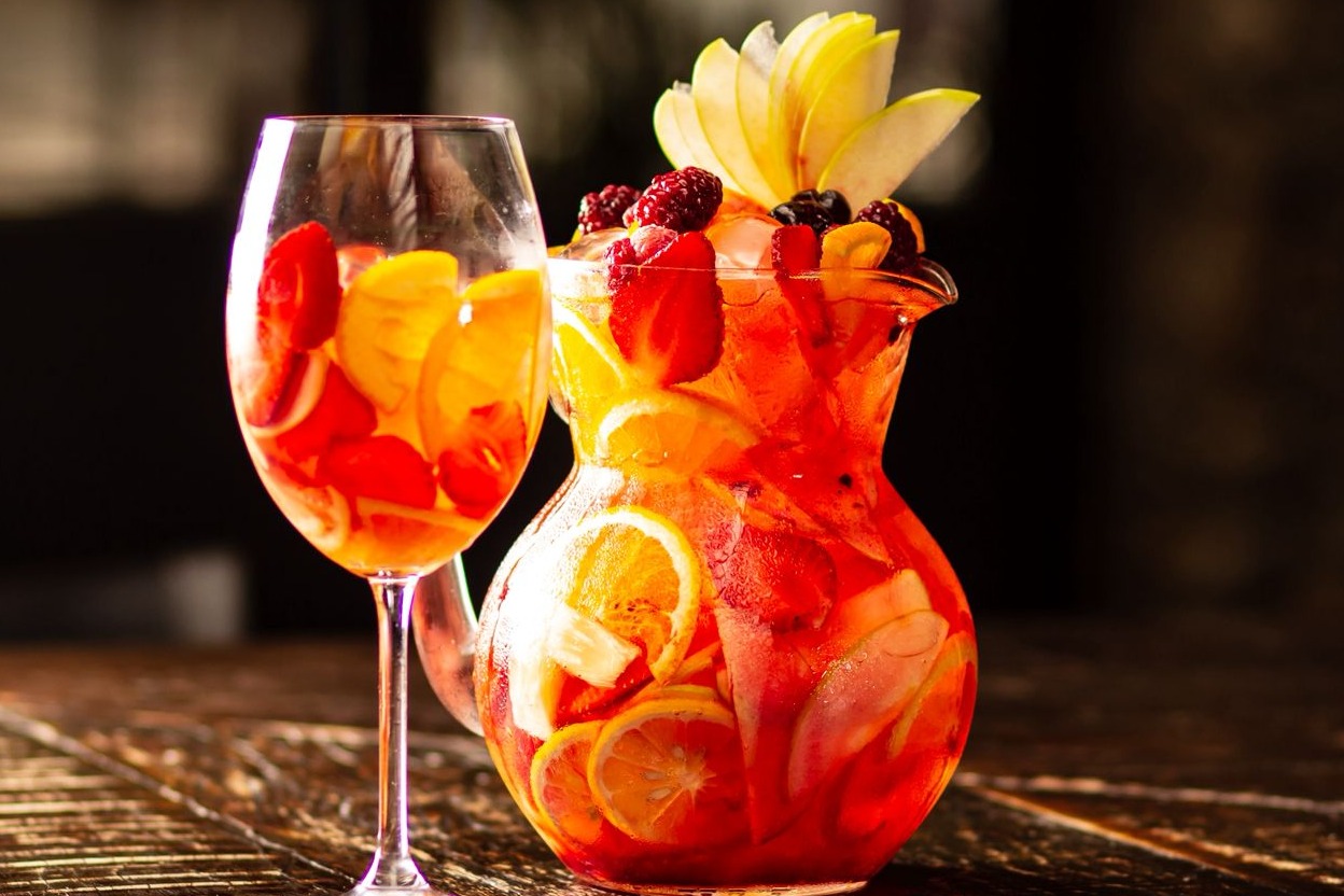 Espumante Brut, brandy, licor de pêssego e frutas frescas